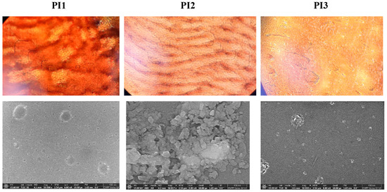 OM ((top), magnification 20×) and SEM (bottom) images of PI1–PI3 film surfaces.