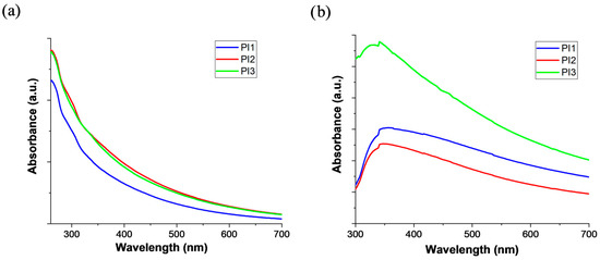 Spectral characterization by UV-Vis absorption and fluorescence was carried out with the aim to evaluate the electronic transitions induced by the triazine and imide heterocycles in polymers PI1–PI3, and also the presence of molecular interactions. Figure 6 illustrates the electronic absorption spectra of these polyimides recorded in DMSO solution and in solid state.