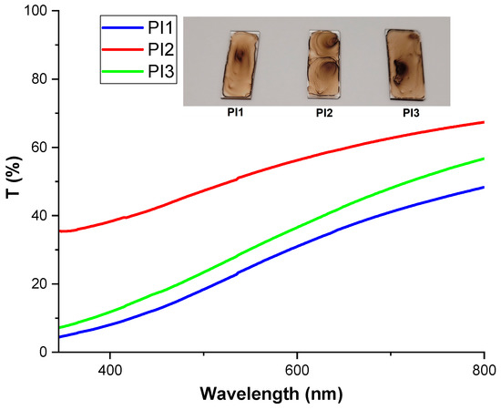 Another important aspect to be mentioned here is related to the obvious intensification of the CTC band for these polymers, mostly induced by the better planarity of the macromolecules in solid state, which definitely favors the CTC transitions. Usually, the colors of polyimide films are much deeper when CTC formation is stronger. As mentioned earlier, our polymer films are brown-black in appearance and this correlates well with our assumption on CTC strength. Such a characteristic of “black polyimides” was previously observed for other polyimides derived from nitrogen-containing diamines [53]. According to the transmittance spectra shown in Figure 7, these PI films, especially PI1 and PI3, experience a significant decrease in the optical transmittance on overall UV-Vis spectral range. For instance, the thin film of PI1 is almost opaque at the wavelength of 500 nm, showing 18% transmittance at 500 nm and 31% at 600 nm. The highest transmittance of PI2 can be explained by the presence of low polarizability trifluoromethyl groups that reduces the CTC formation through steric hindrance and inductive effect leading to weakening chain-to-chain cohesive forces.