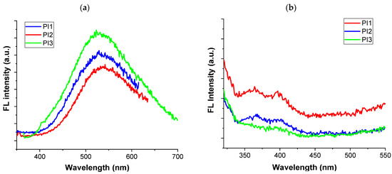 Since 1,3,5-triazines as electron acceptor units form the most attractive building blocks in the development of thermally activated delayed fluorescence (TADF) materials with high efficiencies and long operating lifetimes in OLEDs [54], it is of particular interest to explore the fluorescence properties of PI1–PI3 having this heterocycle as a constitutive structural element. To the best of our knowledge, the synergistic effect of 1,3,5-triazine and DOPO units on the fluorescence properties of polyimides is still unknown. Thus, the fluorescence behavior of the present polymers in DMSO solutions and condensed state (thin films) were investigated. A well resolved fluorescence band was recorded in the spectral pattern of all polyimides, in the range of 528–539 nm, which indicated their ability to release green light (Figure 8a). This emission was associated with 1,3,5-triazine since this heterocycle is a well-known electron-deficient moiety used in green and blue TADF emitters [54]. Previous studies on related polyimides containing DOPO units have highlighted that their emission in polar solvents occurs in the UV-blue spectral range [46], which definitely provides support for our statement. Additional evidence for the origin of the fluorescence (FL) bands of our polymers associated with triazine emission comes from the position of their maxima. Changes in the structural assembly of diimide segment of PI1–PI3 affected the FL spectra in terms of emission wavelength (small shifts) and emission intensity. Since the main polyimide chains incorporating triazine heterocycle adopt different conformations, it was expected to obtain some differences in the FL maxima. In this context, it was found that PI3 with the most flexible main chains emitted more intense light at a lower wavelength (528 nm) compared to the more rigid polymers, PI1 and PI2, that released light of lower intensity at 534 and 539 nm, respectively.