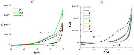 Although PI1–PI3 do not contain electron donating units, their electroactivity was screened in the anodic region to survey the existence of any possible oxidation processes. According to Figure 9a, all polyimides displayed a broad CV band centered at 1.55, 1.48, and 1.37 V vs. Ag/AgCl for PI1, PI2, and PI3, respectively, that can be associated with electron release and formation of radical cations at the NH group of residual, uncyclized amidic acid groups. Similar results were obtained on related polyimides containing triazine heterocycle having hyperbranched structure [55], when clear oxidation peaks appeared in CV curves at different potentials under positive sweeps. However, no comment was provided with respect to the origin of these peaks. The radical cations of PI1–PI3 formed during oxidation were unstable and deactivated in the next CV scans (Figure 9b), denoting weak electroactivity of these polymers in the anodic region. This was expected since the C=O unit of the amide group withdraws electrons, which are no longer available to restore the neutral molecules, and thus, the oxidation processes of the studied polymers are completely irreversible.