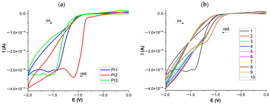 The expected n-doping-type character of these polymers is further demonstrated and discussed on the basis of the electroactivity detected in the cathodic region. Hence, all polyimides displayed electrochemical reduction processes that were observed at relatively low potentials (Figure 10a), varying between −1.1 V and −1.48 V vs. Ag/AgCl (the first reduction peak).