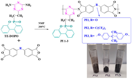 Synthesis of DOPO-substituted triazine-containing polyimides PI1–PI3 (the inset shows the images of the obtained polyimide powders).