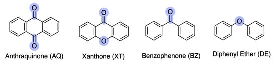 Anthraquinones (AQs) are characterized by a 9,10-anthracenedione core structure, which contains three fused phenyl rings with two carbonyl groups located on the central aromatic ring. Up to 2021, around 700 AQs have been isolated from terrestrial and marine sources, such as fungi, bacteria, lichens, sponges, and marine invertebrates [10]. Xanthones (XTs) are another class of oxygenated heterocycles containing a dibenzo-γ-pyrone moiety [12]. Retaining the tricyclic structure of AQ, XT differs by having one ether and carbonyl linkage instead of two carbonyl groups on the central aromatic ring. Marine XT derivatives have been reported with several biological activities and with suitable features for drug discovery [13,14]. Benzophenones (BZs) are another group of aromatic ketones, which consist of two phenyl rings attached to the same carbon atom of the carbonyl group [15]. Usually, BZs are intermediates in the synthesis of XTs [16]; several BZ derivatives isolated from marine sources exhibit interesting bioactivities [15]. Diphenyl-ethers (DEs) are aromatic compounds that possess two phenyl groups attached by an ether linkage. Similar to the previously reported secondary metabolites, several DEs isolated from the marine environment have shown interesting biological activities [17,18].