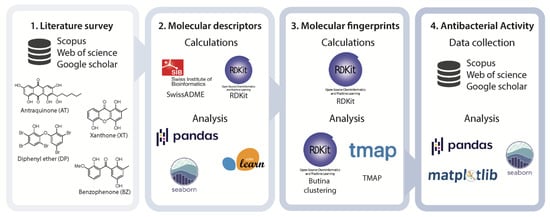 In this work, we gathered and studied a dataset of 246 marine AQs, XTs, BZs, and DEs. The dataset was analyzed according to the scaffold, antibacterial activity, and marine sources. As far as we know, the chemical space occupied by the studied MPs was mapped for the first time using molecular descriptors and fingerprints and framed according to the drug-likeness concepts and to an antibacterial potential ranking. Figure 2 depicts the schematic representation of the data collection and the tools used for the different calculations and analyses.