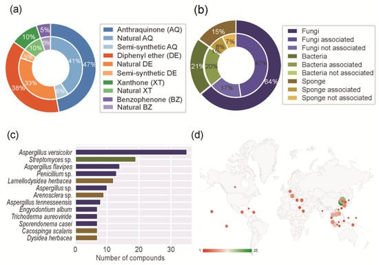 The inner circle of Figure 3b shows the distribution of the MPs isolated from marine associations, such as fungi and bacteria. In this case, the active compound was considered to be produced by the bacteria. Five MPs were isolated from more than one source (Table S1).