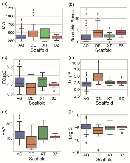 Distribution of MW (a); number of RBs (b); FCsp3 (c); log P (d); TPSA (e); and log S (f) according to the scaffold of the identified marine polyketides (blue for AQ, orange for DE, green for XT, and red for BZ). The box represents the values between the interquartile range (first and third quartiles). The whiskers represent the points within 1.5 times the interquartile range, and the diamond markers the outliers.