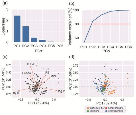 PCA analysis: (a) eigenvalues and (b) cumulative percentage of explained variance for each principal component (red dashed line represents the threshold); (c) loadings plot with the first (PC1) and second (PC2) components with projections of each MP in the reduced space (black circles); (d) PCA scatter plot with projections of each MP in the reduced space, where each MP was colored according to its scaffold (blue for AQs, orange for DEs, green for XTs, and red for BZs).