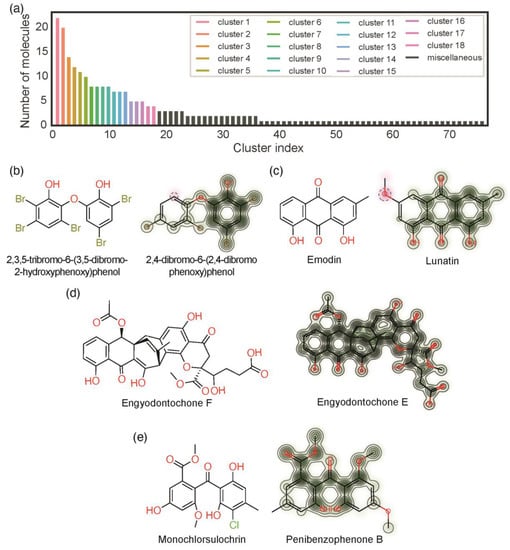 For each cluster, the centroid corresponds to the compound that was considered the archetype of that cluster. The structures of the centroids of clusters 1, 2, 3, and 4 are depicted in Figure 6b–e (on the left). The structures of the most dissimilar compounds within these are also depicted in Figure 6b–e (on the right). Similarity maps between the centroid and the most dissimilar compound are also depicted in Figure 6b–e (on the right) [45]. In these similarity maps, the atoms colored in green have a positive impact on the similarity, while the atoms colored in pink have a negative impact on the similarity. These clusters were used to analyze the antibacterial activity of marine polyketides.