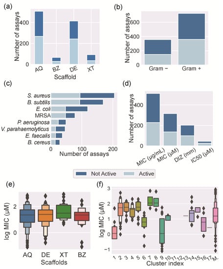 Antibacterial activity analysis: (a) bar plot of the antibacterial assays performed for the studied MPs according to their scaffold; (b) bar plot of the antibacterial assays according to the Gram classification of the screened bacteria; (c) bar plot of the most frequently screened bacteria; (d) bar plot of the metrics and units used to evaluate the antibacterial activity; box plot of the distribution of log MIC values according to the (e) scaffold or (f) cluster of the MPs.