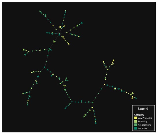 TMAP visualization of the studied MPs colored by the category of antibacterial potential (not active, not promising, promising, very promising).