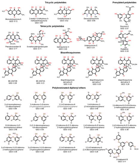 The tricyclic polyketides subfamily contains AQs or AQs derivatives bearing a simple substitution pattern. These compounds are the smallest compounds within this series (MW < 300). In common, these structures possess a substituent (hydroxyl or methyl group) at both ortho positions to the carbonyl group. The tetracyclic subfamily contains AQs or AQs derivatives with at least one additional heterocycle. These compounds are the least lipophilic compounds within this series (mean log P of 1.25) and are the most drug-like molecules (mean QED value of 0.63). The prenylated subfamily contains MPs with two aryl groups, linked either by an ether or a carbonyl linkage, substituted with a prenyl group. These compounds are non-planar and have the highest number of RBs within this series (six rotatable bonds). The bisanthraquinones subfamily contains two dimeric AQs, produced by a marine streptomycete, and three semi-synthetic derivatives obtained through dehydration, oxidation, and reduction. These large compounds (mean MW of 554.53) are the most polar compounds within this series (mean TPSA of 154.63). Bisanthraquinones are the least drug-like molecules (mean QED value of 0.26). The polybrominated diphenyl ethers subfamily contains DEs substituted with several bromine atoms (from 3 up to 7 bromine atoms). These compounds are the most lipophilic (mean log P of 5.70) and least polar (mean TPSA of 47) within this series. All of them are practically insoluble in water (mean log S of −7.34).