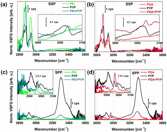 At chiral polarizations (Figure 2d), C–H vibrational bands of PGA were identified at 2890, 2934, and 2970 cm−1. We attributed the first and third vibrational bands to the out-of-plane and in-plane Cα-H stretching modes, respectively, governing chirality in amino acids. This doublet was also obtained in the Raman spectra of alcohols [21]. Above 3000 cm−1, a very weak signal with broad bandwidth was detected in both SPP and PSP polarizations, suggesting that PGA does not form well-ordered β-sheet or α-helical arrangements since the characteristic chiral N–H stretch at ~3300 cm−1 was missing. Instead, PGA most probably lies parallel to the surface of PEI in a random coil structure, given that the chiral N–H stretching signal is forbidden in random coil and disordered structures [35]. We found that the overall VSFG signal decreased when PGA was adsorbed on PEI, which was most likely due to destructive interference between the methylene modes of PEI and PGA.