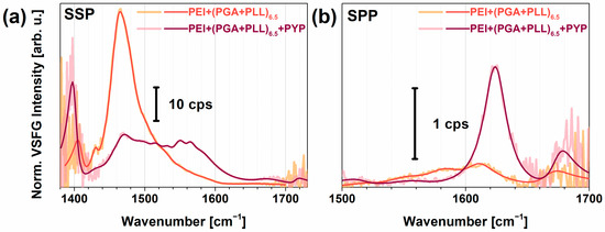 Since the homogeneity of the PEI and PEI+PGA layers can be improved by creating several pairs of oppositely charged layers [66,67,68], we studied how the VSFG spectra of the topmost layer of PGA changed when 0.5 versus 6.5 pairs of layers were built up. The results are summarized in Figure S3. In each of the applied polarization combinations (PPP, SSP, SPP), we observed a much (factor of two) higher signal for 6.5-pair layers due to the higher surface homogeneity. Importantly, the red-shifted O–H stretching mode in each polarization showed a higher signal which can be attributed to a well-ordered interfacial water structure near the charged side chains of amino acids.