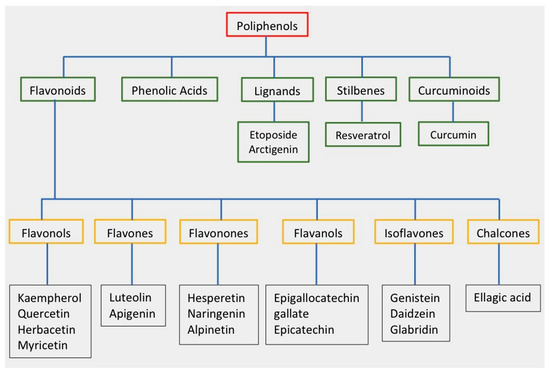 Polyphenols are secondary metabolites that are produced by plants, and they are characterized by the presence of numerous phenolic rings [10]. The main sources of polyphenols are blueberries, grapes, olive oil, cocoa, nuts, peanuts, and other fruits and vegetables that contain up to 200–300 mg of polyphenols per 100 g fresh weight [11]. Figure 1 shows the classification of the main groups of polyphenols.