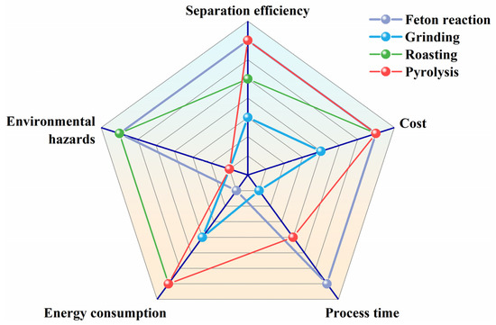 Due to the large difference in wettability between pure LCO and graphite, flotation can easily separate them. The presence of organic coatings on the surface of spent electrode materials reduces the difference in wettability between LCO and graphite, resulting in a decrease in flotation separation efficiency [61]. Pretreatment methods such as the Fenton reaction, grinding, roasting, and pyrolysis can effectively remove organic binders and improve flotation separation efficiency [62]. The degree of removal of organic coatings directly affects the flotation separation efficiency. Figure 5 shows the process evaluation of different pretreatment-flotation methods. The Fenton reaction and ball milling are able to completely remove organic coatings but with difficulty, resulting in low flotation separation efficiency. Roasting and pyrolysis can completely remove organic coatings and achieve ideal separation effects, but roasting produce toxic gases such as HF, which is harmful to the environment, and pyrolysis requires the introduction of inert gases; moreover, the pyrolysis products accumulate on the surface of electrode materials and require further treatment, increasing costs [63]. Therefore, there is an urgent need for a clean and efficient method to remove organic coatings.