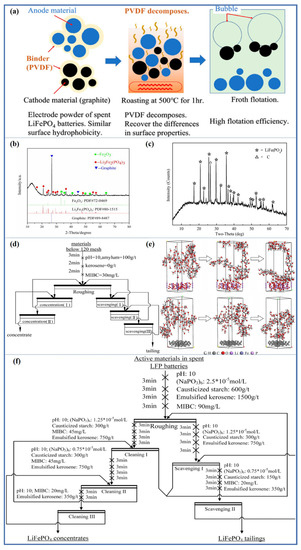 From the above research, it can be seen that thermal treatment can effectively improve the separation efficiency of spent LFP, but it is still unable to achieve efficient separation of black mass. Therefore, more selective agents must be developed to improve the recovery of LFP. Subsequent research investigated the effect of causticized soluble starch on the flotation behavior of spent LIBs after pyrolysis [68]. The study found that causticized soluble starch can selectively adsorb on the surface of spent LFP, increase the hydrophilicity of LFP, and effectively improve the flotation separation efficiency. Theoretical calculations show that the adsorption energy between causticized soluble starch and LFP is −77,308.24 KJ/mol, while that between causticized soluble starch and graphite is −167.55 KJ/mol. Therefore, the interaction between causticized soluble starch and LFP is stronger than that between causticized soluble starch and graphite. The adsorption model of causticized soluble starch on the cathode and anode materials is shown in Figure 7e, where causticized soluble starch adsorbs slightly on the surface of graphite, while more causticized soluble starch adsorbs on the surface of LFP. After the black mass is pyrolyzed, the flotation process shown in Figure 7f is adopted, and the grade of the LFP concentrate is 84.33%, with a high recovery of 91.57%. The recovered LFP concentrate mainly consists of LFP and a small amount of graphite, which can be restored and regenerated into new anode materials. The anode material restored and regenerated is used in a new battery, exhibiting good electrochemical performance. Economic analysis shows that the cost of this process is 69.62% lower than that of traditional processes.