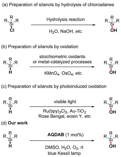 Different strategies for the synthesis of silanols. (a) Preparation of silanols by hydrolysis of chlorosilanes. (b) Preparation of silanols by oxidation. (c) Preparation of silanols by photoinduced oxidation. (d) Our developed one-pot synthesis of Silanols from Silanes.