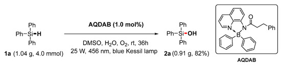 We initiated the study by investigating the hydroxylation reaction of triphenylsilane 1a (Table 1). Through screening different reaction conditions, the optimal reaction conditions are obtained as follows: aminoquinolate B,B-diphenyl complex AQDAB as the photocatalyst (1.0 mol%), O2 atmosphere, irradiation by a 456 nm blue Kessil lamp, in DMSO/H2O (1 mL/50 µL) at room temperature for 36 h (Entry 1). Under optimal conditions, triphenylsilanol 2a can be isolated with a yield of 88%. Then, the effect of each factor under these conditions was explored through control experiments. In the absence of AQDAB, O2, and light sources (Entries 2–4), the reaction will not take place. This indicates that these factors play an important role in the photocatalysis process. Using air instead of O2 caused the yield to drop to 17% (Entry 5). Then, we also explored the role of the solvent. Several other polar aprotic solvents, such as DMF and DMA, also afforded the product, albeit in lower yields (entries 6, 7). The use of DCM and MeCN as solvents results in very low reaction yields (Entries 8, 9). When the reaction time was reduced to 24 h, the yield dropped to 68% (Entry 10). This is because the triphenylsilane didn’t react completely. When white light is used as the light source, the reaction cannot proceed at all (Entry 11). Increasing or decreasing the amount of catalyst equivalent decreases the yield of product 2a (Entry 12, 13).
