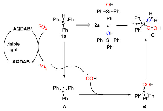 Based on the above observations and previous reports [43,44], a plausible mechanism for this photooxidation process was proposed, which is shown in Scheme 4. First, AQADB was excited to generate AQADB* species under visible light irradiation. Then, AQADB* interacted with 3O2 to generate 1O2 through the energy transfer (ET) process. Through this pathway, the excited state of the used photocatalyst AQADB* returned to its ground state. Subsequently, the generated 1O2 would react directly with silanes 1a, abstracting a hydrogen atom and forming a transient silil radical A plus a hydroperoxy radical HOO•. These two radical species would recombine to generate the Si–O bond, leading to the production of silylperoxide B. H2O might act as a nucleophile to attack silylperoxide B, thus forming a pentavalent ate complex C, which could decompose into silanol 2. The proposal that C was involved in was based on the observed different yields between the reactions with or without external water.
