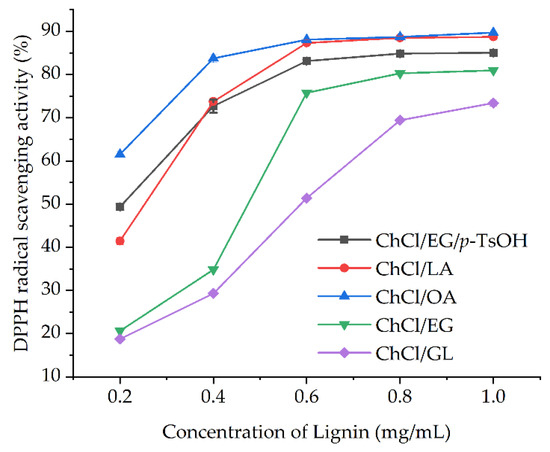 Lignin contains a large number of phenolic hydroxyl groups and has potential as a natural antioxidant. Many studies have found that the phenolic hydroxyl content in lignin has a direct relationship with the extraction method and the source of raw materials [31]. Therefore, the scavenging activity of the lignin extracted using the five DESs was investigated against DPPH radicals. As shown in Figure 1, the scavenging activity against DPPH radicals gradually increased with increasing lignin concentration and differed among the different types of lignin. The lignin isolated using carboxylic acid-based DES showed higher scavenging activity against DPPH radicals than the lignin obtained using alcohol-based DES. The highest scavenging activity against DPPH radical appeared at a 0.2 mg/mL concentration of the lignin obtained using ChCl/OA, followed by ChCl/EG/p-TsOH, choline chloride/lactic acid (ChCl/LA), and choline chloride/ethylene glycol (ChCl/EG). However, when the lignin concentration exceeded 0.6 mg/mL, the DPPH radical-scavenging activity of the lignin obtained using carboxylic acid-based DES increased slowly and remained mainly between 80% and 89%. When the lignin concentration was 1.0 mg/mL, the lignin obtained using the various DESs showed a scavenging activity of 73.41–89.73% against DPPH radicals, with ChCl/OA > ChCl/LA > ChCl/EG/p-TsOH > ChCl/EG > choline chloride/glycerol (ChCl/GL). The lignin separated using the five kinds of DESs showed different scavenging activity against DPPH radicals, mainly due to differences in the content of phenolic hydroxyl in the lignin structure. According to previous reports, lignin with a high content of phenolic hydroxyl possessed the best antioxidant ability [32,33].