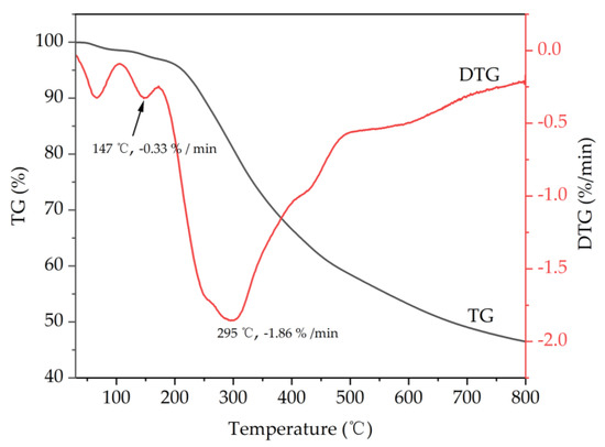 Lignin is an organic polymer mainly composed of a phenylpropane unit and connected with various chemical bonds. The types of chemical bonds and functional groups directly affect the pyrolysis properties of lignin. To explore the thermal decomposition characteristics of the lignin extracted from WCSs with DES (ChCl/EG/p-TsOH), a thermal analysis was performed. The thermogravimetric (TG) and differential thermogravimetric (DTG) curves of the lignin are presented in Figure 3. According to the TG curves, the weight loss curve of the lignin was divided into three main stages, namely, the evaporation of free and bound water, depolymerization, and carbonization. Between 30 °C and 200 °C, the lignin lost approximately 4% of its mass at a weight loss rate of 0.33%/min. This stage was mainly due to the dehydration and volatilization of small molecule-based organic acids. The thermal decomposition rate of the lignin accelerated starting from 200 °C. At this stage, the thermal degradation of the lignin mainly involved chemical bond breaking (mainly C–O and C–C in the aryl ether structure) and side-chain oxidation (carbonylation, carboxylation, dehydrogenation, etc.) [38]. At temperatures above 400 °C, this stage mainly involved the cleavage of C–C bonds and demethoxylation of the benzene ring in the lignin skeleton structure [39], accompanied by the generation of coke. With the increase in temperature to 800 °C, the weight loss of the lignin slowed down gradually due to the condensation of the aromatic structure, resulting in a high residual amount of 46.49%.