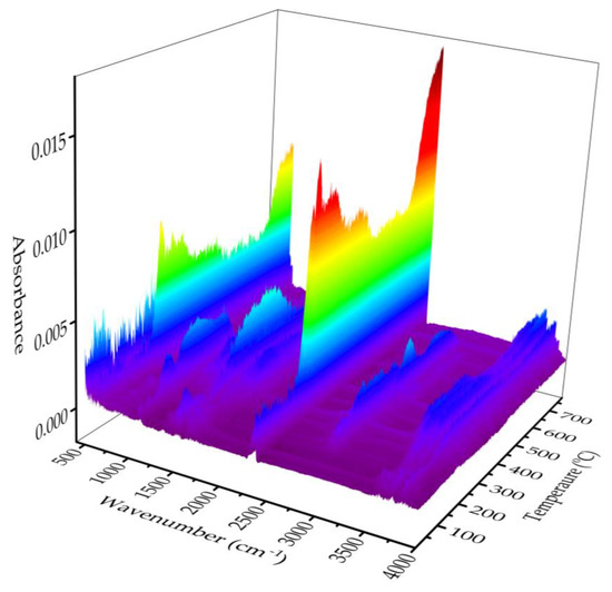 TG-FTIR spectroscopy is an effective tool for the dynamic monitoring of volatile substances. To further explore the types of volatile substances involved in the pyrolysis of lignin, 3D-FTIR spectra analysis was performed on the sample. As shown in Figure 4, the main thermal degradation of the lignin mainly occurred at 200–600 °C. A variety of volatile organic compounds were detected, with different absorption wavenumbers corresponding to their functional groups. The peak at 3500–3800 cm−1 corresponds to the H2O derived mainly from the dehydroxylation of the lignin. The peak at 2939 cm−1 corresponds to the CH4 derived mainly from demethoxy or methyl groups. As observed in other types of lignin [40], the maximum peak at 2310 cm−1 corresponds to CO2, a major pyrolysis product primarily derived from the decarboxylation of the lignin. The peak at 2185 cm−1 corresponds to the CO arising from the ether functional group in the side chain of the lignin, and only appears at high temperatures, without the obvious CO absorption peak at low temperatures. The multiple absorption peaks at 1800–1000 cm−1 were ascribed to many pyrolysis products such as alcohols, phenols, and aromatic compounds [39,40], resulting from the ring-opening reaction of the aromatic structure and the fragmentation in the side-chain of the lignin.