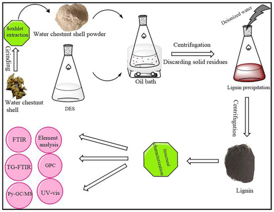 The water chestnut is widely cultivated in several provinces in China. Water chestnut shells (WCSs), as the main by-product in water chestnut production, are mostly incinerated or discarded, resulting in environmental pollution and resource waste. Polysaccharides and polyphenols contained in WCSs have been developed and applied in the pharmaceutical industry, but their high lignin content has been neglected. Furthermore, the natural structural properties and high-value applications of lignin obtained from WCSs have not been fully investigated. Lignin is an aromatic polymer composed of a variety of chemical bonds linked to phenylpropanol derivatives, containing a variety of reactive functional groups, which can be converted into fuels, chemicals, and bio-functional materials [1]. The key to the high-value utilization of lignin is to develop efficient separation methods. Currently, lignin is commonly extracted from lignocellulosic biomass using acids, alkalis, and organic solvents, but these methods operate under harsh conditions, causing environmental problems [2]. Therefore, it is urgent to find an environmentally friendly separation method to develop the lignocellulose refining industry. Recently, many environmentally clean technologies, such as green solvent and supercritical fluid extractions, have been reported for lignin extraction [3,4]. However, these techniques have various drawbacks. For example, the separation of lignin using ionic liquid has attracted attention due to the advantages of a mild separation process and high efficiency, but its high cost and the lack of toxicological data limit its industrial applications [3]. With the discovery of low-cost and easy-to-prepare deep eutectic solvents (DESs) for lignin fractionation [5], the development of green, efficient, and highly selective DES systems has become a research hotspot.