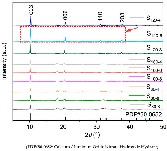 The XRD patterns of CaAl-PO4-LDHs synthesized after crystallization reactions are shown in Figure 1. The main characteristic peaks of CaAl-PO4-LDHs display sharp and intense (003), (006), (110) and (203) reflections corresponding to PDF#50-0652, which indicates that the prepared samples had a typical hydrotalcite lamellar structure [21]. The shifts in the diffraction peaks towards lower angles indicate that PO43− was successfully intercalated into the interlayer spacing of calcium–aluminum hydrotalcites [14]. Furthermore, as shown in Table 1, by Bragg’s law (2dsinθ = nλ), the interlayer spacing (d003, d006 and d110) of CaAl-PO4-LDHs and PDF#50-0652 were calculated. The characteristic peaks of the samples synthesized at different crystallization temperatures and times were varied. The XRD spectrum shows that the characteristic peak of the sample (S120-6) had the sharpest peak shape and the highest intensity. It has been concluded that a synthesis temperature of 120 °C and a duration of 6 h for crystallization are the optimal process parameters for the preparation of CaAl-PO4-LDHs.