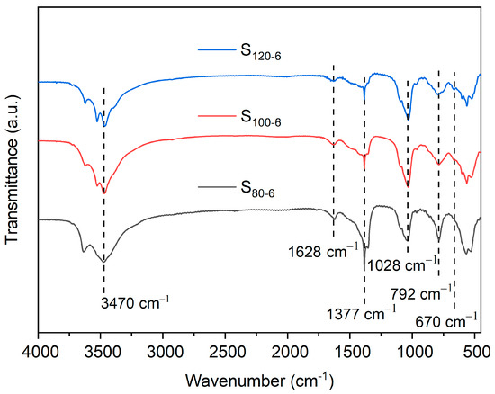 Figure 2 shows that the positions of the absorption peaks of FTIR spectra of CaAl-PO4-LDHs synthesized at different crystallization temperatures are similar. The signals near 3470 cm−1 are related to the stretching vibration of the water molecules in the interlayer [22,23]. The absorption signal at 1628 cm−1 corresponds to the H-O-H bending vibration [14]. The characteristic absorption signals of the CO32− group were observed at 1377 cm−1 and 792 cm−1, which were caused by the adsorption of CO2 by CaAl-PO4-LDHs after exposure to air at the end of synthesis [24]. The signals below 670 cm−1 were attributed to O-M-O bonds and M-O (where M is Ca or Al) bonds [25]. A telescopic vibrational signal of P-OH appeared at 1028 cm−1, indicating that PO43− was successfully inserted into the calcium–aluminum hydrotalcites [26].