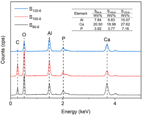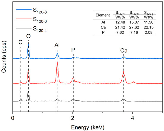 The method of EDX analysis enabled the indirect analysis of the successful insertion of PO43− anions into the interlayer [27], and the results are shown in Figure 3. The ratios of the relative contents of Ca and Al of the CaAl-PO4-LDHs samples were close to the theoretical value of 2.0, which indicated the successful synthesis of a typical layered hydrotalcite structure [28]. The content of elemental C in the samples synthesized at 100 °C was significantly higher due to the higher doping of carbonate in the samples. The C element was almost absent in S120-6, indicating the oxidation of this sample was less likely to produce CO32−. With the increase in the crystallization temperature, the P content first decreased and then increased. The highest elemental P content in the samples was reached at 120 °C. The results indicate the successful synthesis of CaAl-PO4-LDHs [29].