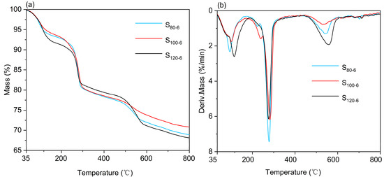 The CaAl-PO4-LDH samples were investigated via TG-DTG in N2 atmosphere, where the TG-DTG curves showed some differences. Figure 5 shows that the CaAl-PO4-LDH samples prepared at different crystallization temperatures all exhibited three thermal weight loss stages [30]. The first thermal weight loss stage (35–174 °C) is the loss of interlayer water molecules [31]. The S120-6 showed the highest thermal weight loss (9.18%) compared to S80-6 (6.66%) and S100-6 (6.23%), indicating that the sample had the highest number of water molecules in the interlayer. In addition, small amounts of anions may be released in the first stage [32]. The second stage (181–342 °C) of thermal weight loss is the detachment of -OH from the surface of CaAl-PO4-LDHs [33]. The weight loss of the S120-6 (11.75%) was lower than the other two samples (13.43% and 11.40%), which indicated that the layered structure was stable and numerous hydroxyl groups were not lost. The third thermal weight loss stage (450–629 °C) is a pyrolysis reaction via the anions in the interlayer [34]. In the third thermal weight loss phase, the S120-6 showed the highest thermal weight loss (8.63%), showing the sample contains the most interlayer anions. Furthermore, the thermal weight loss temperature of the S120-6 was slightly higher than that of the other two samples. Combined with the analysis of previous works, 120 °C is a better crystallization temperature for the preparation of CaAl-PO4-LDH samples via the coprecipitation method.