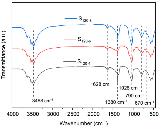 The FTIR spectra of the CaAl-PO4-LDHs samples synthesized at different crystallization times had similar positions of signals (Figure 6). The signals near 3468 cm−1 were related to the hydroxyl stretching vibration in hydrotalcites. The signal at 1628 cm−1 was related to the bending vibration of the H-O-H [14]. The characteristic signals of CO32− corresponded to 1380 cm−1 and 790 cm−1 [24]. The S120-6 had almost no characteristic absorption band of CO32−, indicating the sample was less oxidized. The signals at 1028 cm−1 were caused by the vibration of the PO43−, showing PO43− was successfully embedded in the calcium–aluminum hydrotalcites [26]. The signals below 670 cm−1 were caused by O-M-O bonds and M-O (where M is Ca or Al) bonds [25].