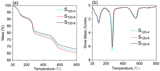 Figure 9 shows that the thermal weight loss pattern of the synthesized samples was consistent with the three stage thermal weight loss pattern of hydrotalcites [30,35]. The sample synthesized at 6 h (S120-6) exhibited greater thermal weight loss (8.63%) than the others, S120-4 (8.20%) and S120-8 (7.78%), which indicates that the relative contents of -OH and PO43− in these samples were higher than those in the other samples. In addition, the initial pyrolysis temperature of the sample prepared via crystallization for 6 h was slightly higher than the other samples. All the results were compared and analyzed to conclude that the better crystallization time for the synthesis of CaAl-PO4-LDHs via coprecipitation was 6 h.
