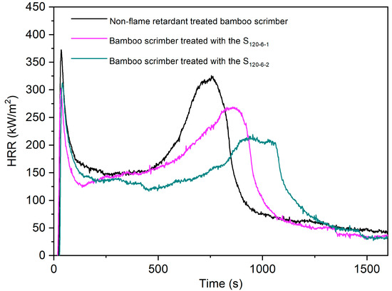 HRR of mass of non-flame-retardant-treated bamboo scrimber and flame-retardant bamboo scrimber.