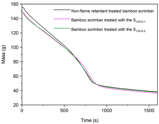 The Mass of Residue (Mass) allows for the visual analysis of the stability of a material at high temperatures. The Mass of Residues of the control group and bamboo scrimber treated with different concentrations of flame retardants are shown in Figure 11. The residual carbon rate indicated the final residual mass of the bamboo scrimber as a percentage of the initial mass. The residual carbon rates of the non-flame-retardant-treated bamboo scrimber, the bamboo scrimber treated with the S120-6-1 and the bamboo scrimber treated with the S120-6-2 were 22.24%, 23.12% and 24.32%, respectively. The results showed that CaAl-PO4-LDHs did not have a significant effect on the residual carbon rate of the bamboo scrimber and only slightly increased its residual carbon rate.