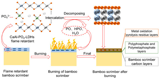 As shown in Figure 12, LDHs make bamboo produce char residue more easily, which can isolate O2 and heat transfer between burning areas and the bottom of the carbon layer. During the combustion of CaAl-PO4-LDHs, hydroxyl groups on layers and interlaminar anions are released in the form of H2O and CO2, which can adsorb a lot of heat and reduce the concentration of combustion gas [39,40]. Thus, the heat release rate can be slowed down, and the ignition time of reconstituted bamboo can be delayed. Additionally, the final pyrolysis residue of CaAl-PO4-LDHs can also catalyze the formation of a more stable carbon layer and cover the surface of bamboo. The physical process of the char residue acts as a protective barrier, resulting in improved flame retardancy for bamboo [41]. So, the flame resistance of recombinant bamboo scrimber can be improved in this way.
