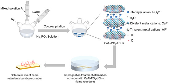 A summary of the CaAl-PO4-LDH experimental samples is shown in Table 4. Figure 13 illustrates the process of synthesizing CaAl-PO4-LDHs and preparing flame-retardant bamboo scrimber.