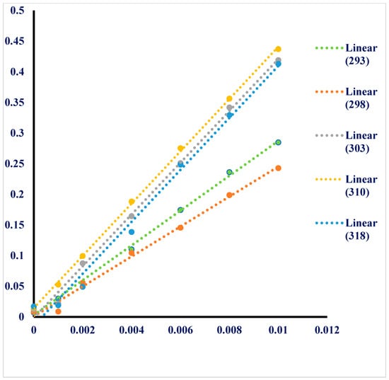 Higuchi and Connors developed a phase solubility diagram that uses X and Y coordinates to explain the inclusion complexes of poorly water-soluble candidates as quests with cyclodextrins (CD) and as a host. This diagram examines the solubility profiles of these candidates and their stabilities constants to determine the efficacy of the inclusion complex’s formation [24]. Figure 2 displays the phase solubility diagram of TQ with SBE-β-CD in water at five different temperatures (293–318 K°), showing that the water solubility of TQ increased linearly with the increase in the molar concentrations of SBE-β-CD. This indicates that this system follows an AL-type solubility diagram [25] with an independent degree of substitution [26]. The apparent stability constants (K1:1) of the inclusion complexes were calculated from the straight-line equation of the phase solubility curve for each separate temperature studied (293–318 K°), and they were found to be 1480–8535 M−1, indicating the formation of a favorable inclusion complex between TQ and SBE-β-CD. The solubility of TQ in water was observed to increase from 0.0154 mM to 0.4369 mM at 310 K (37 °C), indicating that the solubility of TQ in water was greatly improved by the successful formation of the inclusion complex between TQ and SBE-β-CD. The efficiency (CE) of the complexation, defined as the ratio of the concentration of the dissolved complex to the concentration of the dissolved free CD, was well-reported by Loftsson et al. and was used to evaluate the solubilization of hydrophobic molecules in cyclodextrin [27]. From the phase solubility diagram, the CE for the TQ-SBE-β-CD inclusion complex was found to be 1.030, indicating that SBE-β-CD is suitable for the formulation of TQ.