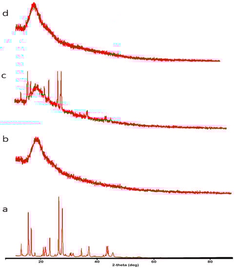 The inclusion complex of TQ with SBE-β-CD was investigated further by using XRD. Figure 4 shows the X-ray diffraction patterns of pure TQ, pure SBE-β-CD, a physical mixture, and their corresponding inclusion complexes. There were no diffraction peaks in the X-ray spectra of SBE-β-CD, while sharp diffraction peaks were obtained in the pure TQ, indicating the crystalline state of the molecule. The same results were observed in the physical mixture but with less intensity. However, the inclusion complex of TQ with SBE-β-CD exhibited well-differentiated diffused X-ray patterns, indicating the amorphous characteristics of the complex. The lack of the crystallinity of TQ is considered clear evidence of the formation of the inclusion complex [28]. This phenomenon indicates an interaction between TQ and SBE-β-CD, ultimately leading to the formation of a new solid phase [28,29]. The X-ray diffraction patterns of the TQ-SBE-β-CD system were characterized by large diffraction peaks, making it impossible to differentiate between pure TQ as a crystal and SBE-β-CD. These findings indicate that TQ no longer exists as a crystalline form, and its solid complexes with SBE-β-CD exist in the amorphous state (Figure 4d). The formation of an amorphous state is significant evidence that TQ was dispersed in a molecular state within SBE-β-CD [30,31].