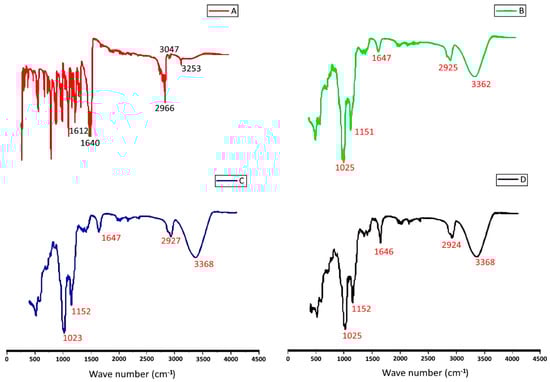 Figure 5 displays the FT-IR spectra of the TQ-SBE-β-CD inclusion complex, pure TQ, pure SBE-β-CD, and a physical mixture of TQ in SBE-β-CD. The spectra were analyzed to investigate the interaction of TQ with SBE-β-CD based on the characteristics of the IR peaks of each component. Pure TQ showed peaks at 2965.928–2875.083 cm−1 (Figure 5A), which correspond to the stretching vibrations bands of isopropyl and CH3 groups. The band at 2922.530 cm−1 represents the spectrum of the C-H stretching of tertiary carbon in the isopropyl group, and the 2875.083 cm−1 band indicates the symmetric stretching of three methyl groups. The SBE-β-CD showed a clear peak at 3368.656, 2926, 1643.605, 1152.034, 1024.975, and 520.617 cm−1 (Figure 5B). However, all these FT-IR bands were shifted to lower frequencies in the spectra of the inclusion complex, indicating that TQ was encapsulated in the SBE-β-CD cavity, and the vibration of TQ was restricted. Furthermore, all the peak bands of TQ disappeared from the inclusion complex spectra, indicating that the breakdown of intermolecular hydrogen bonding within TQ established a weak force in the complex system (Figure 5D).