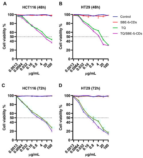 Cell viability of HCT116 and HT29 colon cancer cells treated with SBE-β-CD, TQ, and the TQ/SBE-β-CD inclusion complex. (A,B) represent the cell viability of HCT116 and HT29 at 48 h and (C,D) at 72 h, respectively. Data were expressed as the mean ± standard deviation (SD). The control group was left untreated.