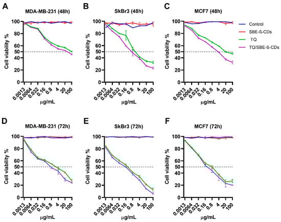 Cell viability of MDA-MB-231, SkBr3, and MCF7 breast cancer cells treated with the SBE-β-CD, TQ, and TQ/SBE-β-CD inclusion complex. (A–C) represents cell viability at 48 h, and (D–F) represents cell viability at 72 h. Data were expressed as the mean ± standard deviation (SD). The control group was left untreated.