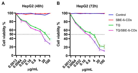 Cell viability % after treating HepG2 with different concentrations of SBE-β-CD, TQ, and the TQ/SBE-β-CD inclusion complex. (A,B) represent cell viability at 48 h and 72 h, respectively. Data were expressed as mean ± standard deviation (SD). The control group was left untreated.