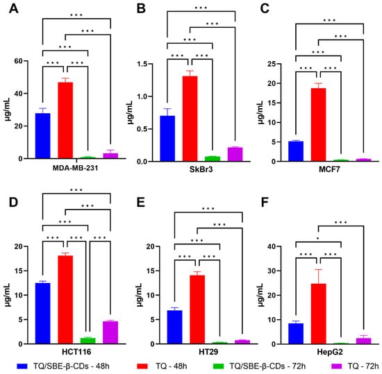 IC50 comparison between pure TQ and TQ/SBE-β-CD inclusion complex treatments on MDA-MB-231 cells (A), SkBr3 cells (B), MCF7 cells (C), HCT116 cells (D), HT29 cells (E), and HepG2 cells (F). Data are expressed as mean ± standard deviation (SD), * p < 0.05, *** p < 0.0001.
