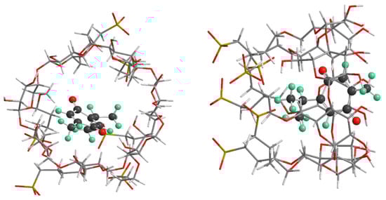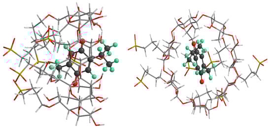 Figure 1 shows the chemical structure of TQ, for which its initial geometry was optimized using the DFT-B3LYP method with a 6-31G(d,p) basis set. The structures of β-cyclodextrin (βCD) were extracted from the crystallographic parameters provided by the Structural Data Base System of the Cambridge Crystallographic Data Center and were optimized by minimizing their energy using the PM6-D3H4 semiempirical method with MOPAC 2012 software [55,56]. The PM6-D3H4 method implements corrections to hydrogen bonding and dispersion. The structure of SBE-β-CD was constructed using the β-CD skeleton by substituting six sulfobutylether moieties randomly at the primary OH groups of the narrow rim on the glucose units of the β-CD. The geometry of the SBE-β-CD was further optimized by the PM6-D3H4 semiempirical method in both the gas phase and aqueous media.