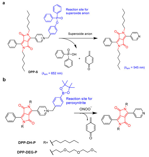 (a) The proposed mechanism between DPP-S and superoxide anion. (b) The proposed mechanism between DPP-DH-P, DPP-DEG-P, and ONOO−.