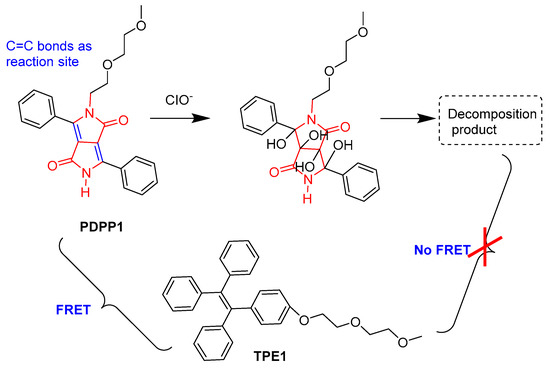 Using the fluorescence resonance energy transfer (FRET) and the aggregation-induced emission (AIE) strategies, Nie et al. developed an organic micellar nanoprobe via the co-assembly of phenyl-diketopyrrolopyrrole (PDPP1) and amphiphilic tetraphenylethene (TPE1) in aqueous solution for the ratiometric detection of hypochlorite (Figure 4) [23]. Upon addition of hypochlorite, C=C bonds in the DPP core were oxidized and the FRET process between PDPP1/TPE1 was broken, resulting in the enhanced emission of TPE1 and decayed emission of PDPP1. The low sensitivity with LOD (32 nM) in a ratiometric manner and the imaging of exogenous and endogenous hypochlorite in live cells were achieved.