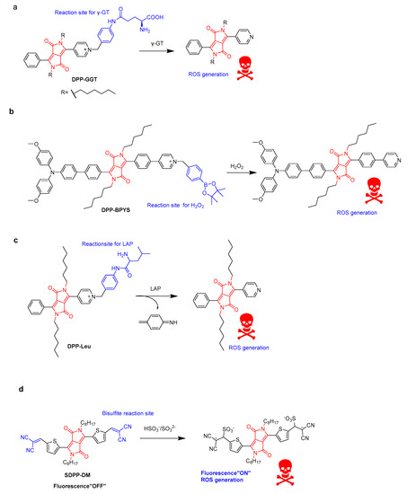 Schematic illustration of (a) γ-GT-triggered DPP-GGT, (b) H2O2-triggered DPP-BPYS, (c) LAP-triggered DPP-Leu, and (d) bisulfite-triggered SDPP-DM.