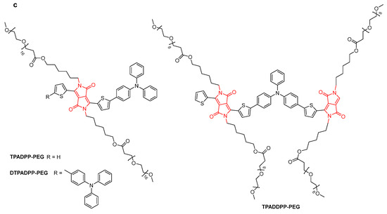 The structure of (a) Ppordpp; (b) PDPP-TP; and (c) TPADPP-PEG, DTPADPP-PEG, and TPADDPP-PEG.